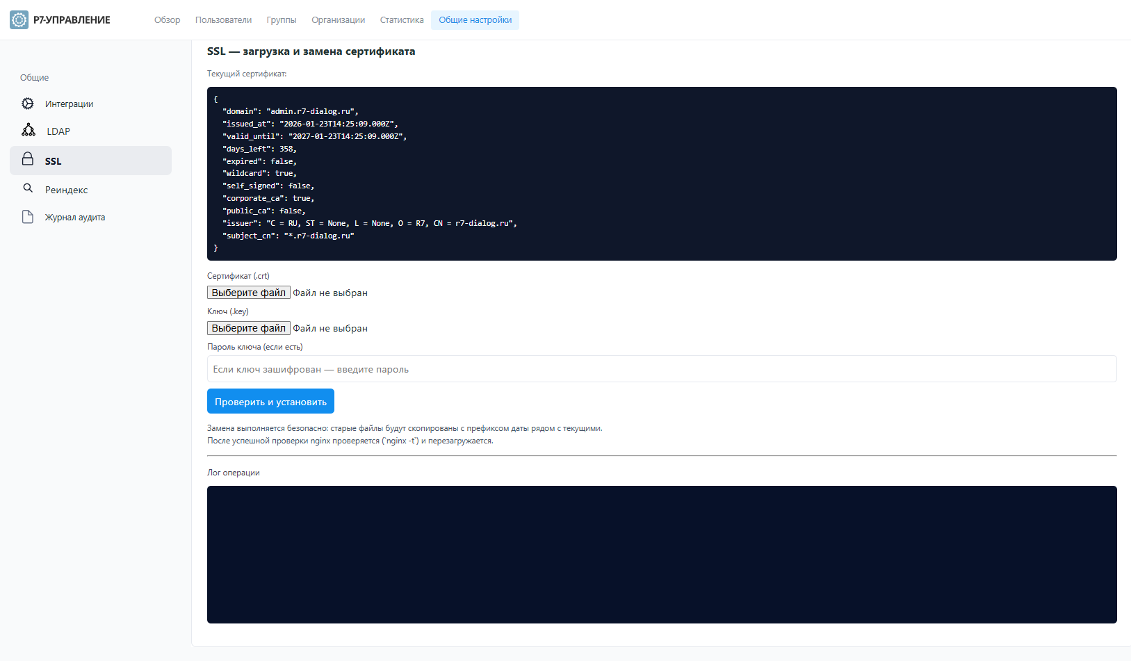Замена сертификата и ключа выполняется безопасно: старые файлы будут скопированы с префиксом даты рядом с текущими. После успешной проверки nginx проверяется с помощью команды nginx -t и перезагружается.