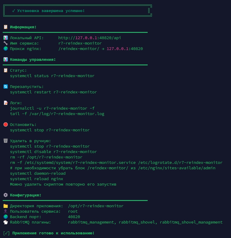 systemctl status r7-reindex-monitor --no-pager # для проверки статуса работы сервиса journalctl -u r7-reindex-monitor -n 200 --no-pager # для проверки лога работы сервиса nginx -t # для проверки конфигурации nginx systemctl reload nginx # для мягкого рестарта сервиса nginx