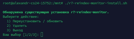 Скрипт r7-reindex-monitor-install.sh делает установку/обновление и (при необходимости) удаление: