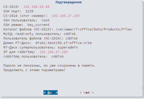 Dialog— интерфейс скрипта;Curl— HTTP(S) запросы к Р7-Диску;Openssh-client/openssh-clients— SSH на Корпоративном сервере 2019;Perl— правкаappsettings.json;Nfs-commonилиnfs-utils— NFS-клиент;Rabbitmq-server+rabbitmq-plugins,rabbitmqctl— уже ставятся с Р7 Диском/Корпоративном сервере 2024 ;- Firewall-утилиты (