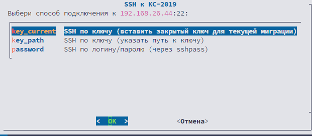 Меню:- SSH по ключу (вставить закрытый ключ для текущей миграции).
