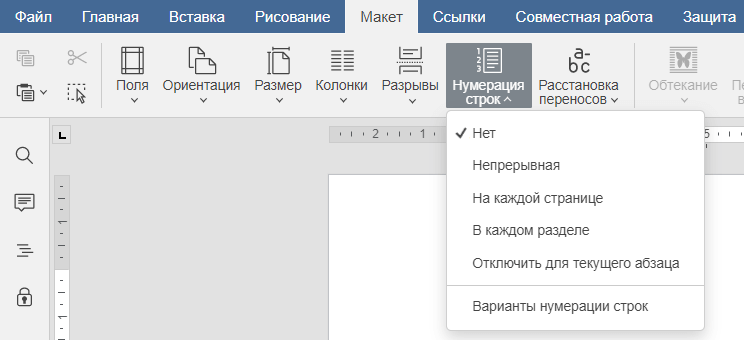- Перейдите на вкладку Макет верхней панели инструментов и щелкните значок Нумерация строк.