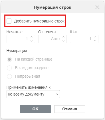 Установите флажок Добавить нумерацию строк, чтобы применить нумерацию строк к документу и получить доступ к расширенным параметрам параметра: