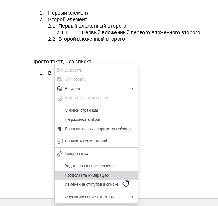 Формат номера — позволяет настраивать внешний вид и структуру нумерации элементов списка. По умолчанию 1, 2, 3,…;