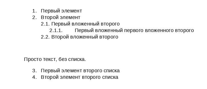 Чтобы изменить уровень списка, щёлкните значок Нумерованный список, Маркированный список или Многоуровневый список и в пункте меню Изменить уровень списка выберите подходящий стиль списка. Чтобы перейти на следующий уровень списка, поместите курсор на начало строки и нажмите на клавиатуре клавишу Tab: