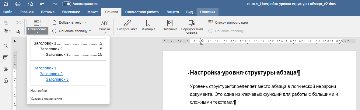 - Автоматически создавать оглавление — при вставке оглавления (вкладка Ссылки → Оглавление) редактор сам соберёт его из абзацев, у которых задан уровень структуры (от 1 до 9):