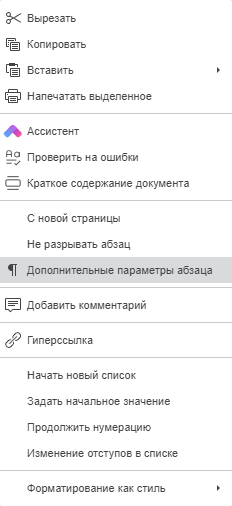 2. Щёлкните по выделенному тексту правой кнопкой мыши и выберите Дополнительные параметры абзаца;