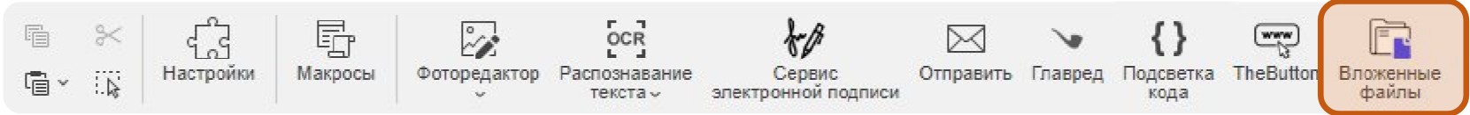 Редактор Р7 позволяет встраивать в документы файлы других форматов (например, презентации, таблицы, текстовые документы) в виде вложенных объектов. Эти файлы сохраняются внутри основного документа и могут быть просмотрены, извлечены или заменены.
