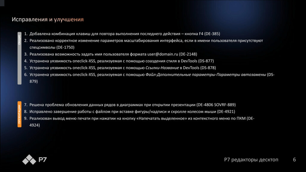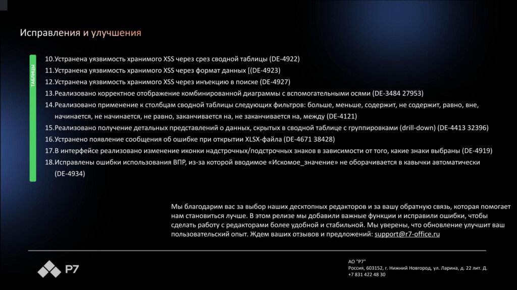 Информация о новых функциях, улучшениях и исправлениях в обновлении продукта