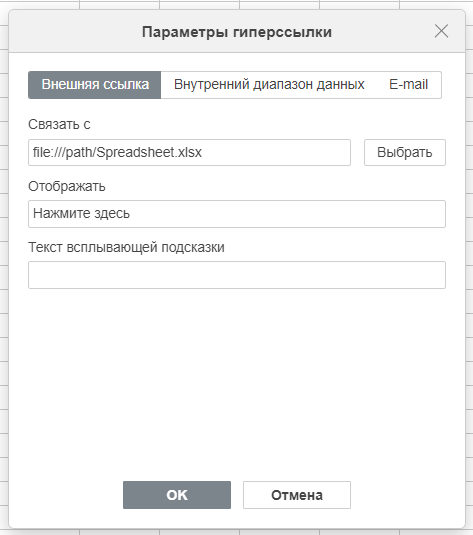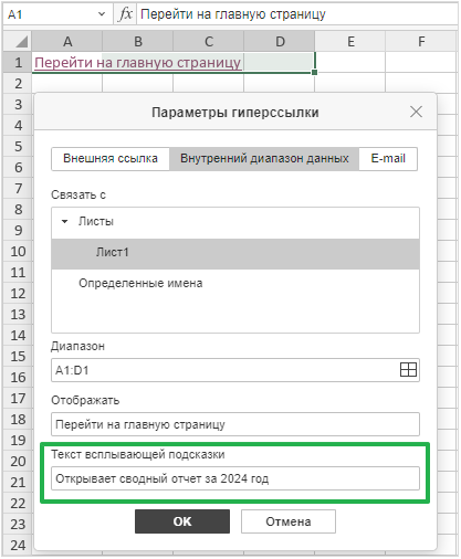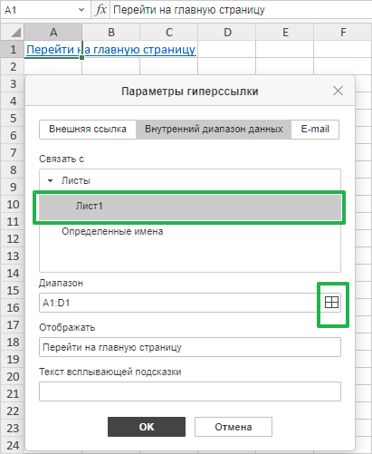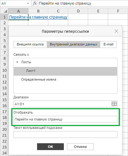 Поле «Отображать»: Здесь находится текст, который будет виден в ячейке и будет кликабельной ссылкой. Если в выбранной ячейке уже был текст, он автоматически подставится сюда. Вы можете его изменить. Например, вместо длинного URL можно написать «Перейти на главную страницу»: