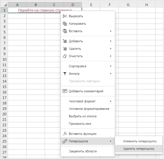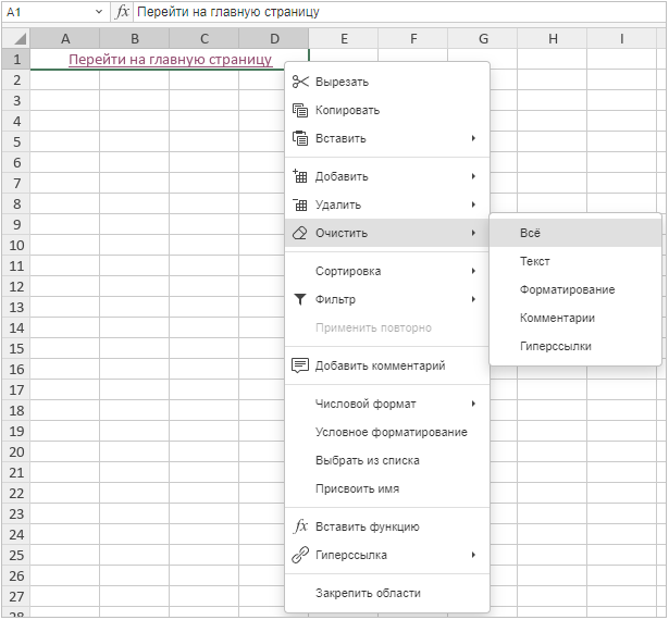 2. Нажмите клавишу Delete на клавиатуре, или щелкните по ячейке правой кнопкой мыши и выберите в меню пункт «Очистить все». Это удалит и ссылку, и содержимое ячейки: