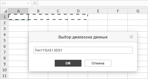 - В выпадающих списках ниже выберите нужный лист и укажите диапазон ячеек (например, A1:D1):