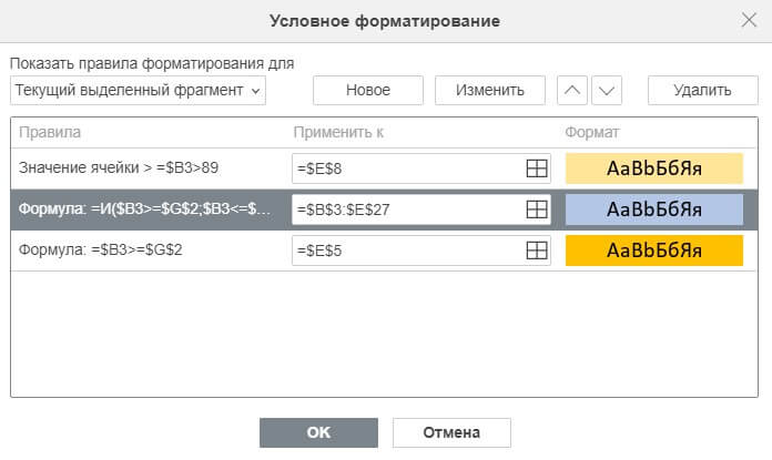 После создания правил условного форматирования их можно просматривать, изменять очередность, редактировать и удалять.