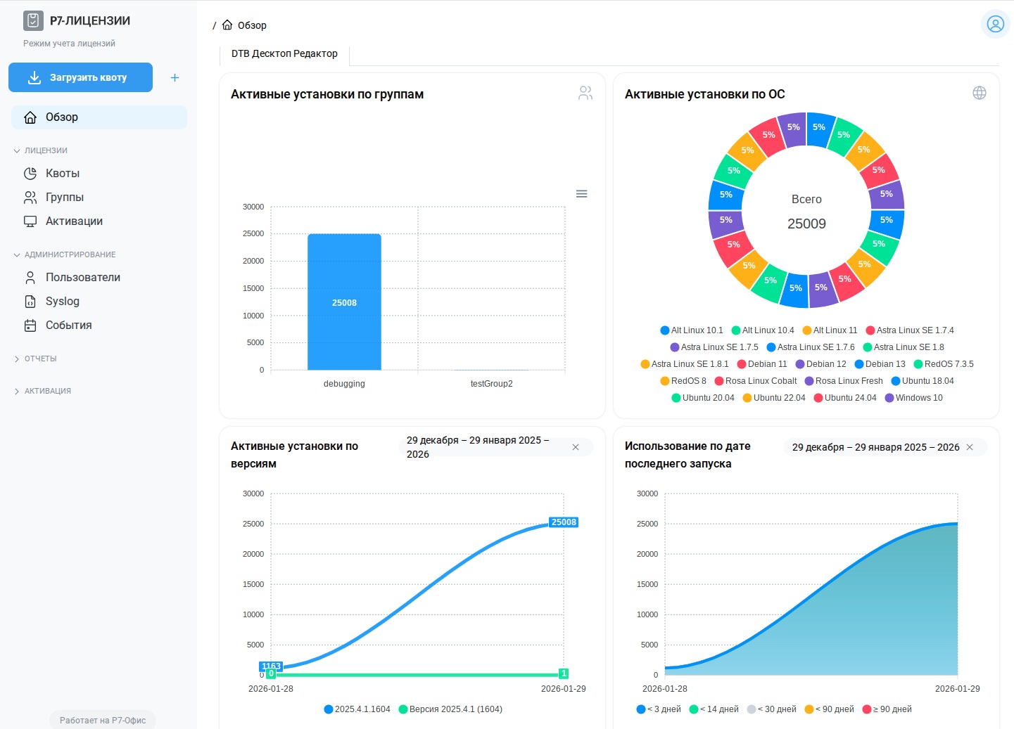 Содержит дашборд со сводной статистикой по установкам и использованию Десктоп редакторов в режиме реального времени.