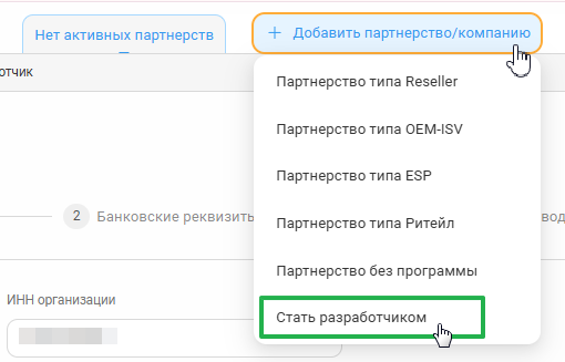 1. Перейдя в личный кабинет, в верхней части экрана нажмите на меню Добавить партнерство/компанию и выберите пункт Стать разработчиком: