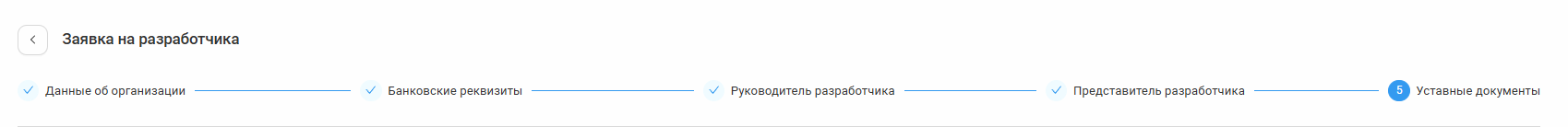 2. Далее заполните все обязательные поля на вкладках Данные об организации, Банковские реквизиты, Руководитель разработчика, Представитель разработчика, Уставные документы:
