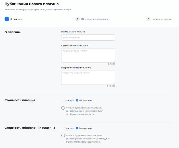 - Стоимость плагина (если выберете «Платный» – потребуется ввести цену за одного пользователя вашего плагина).