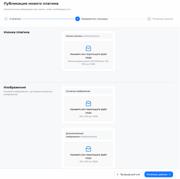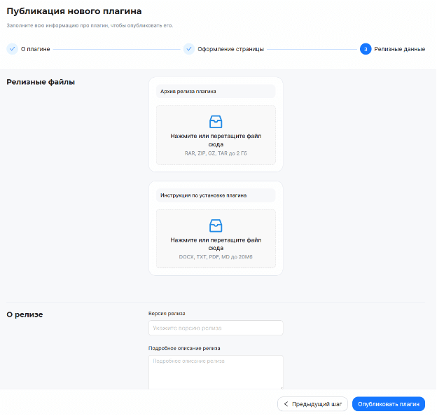 В этом разделе необходимо: загрузить архив с плагином (RAR, ZIP, GZ, TAR, до 2 ГБ), прикрепить инструкцию по установке (DOCX, TXT, PDF или MD, до 20 МБ), указать версию релиза и добавить его описание.