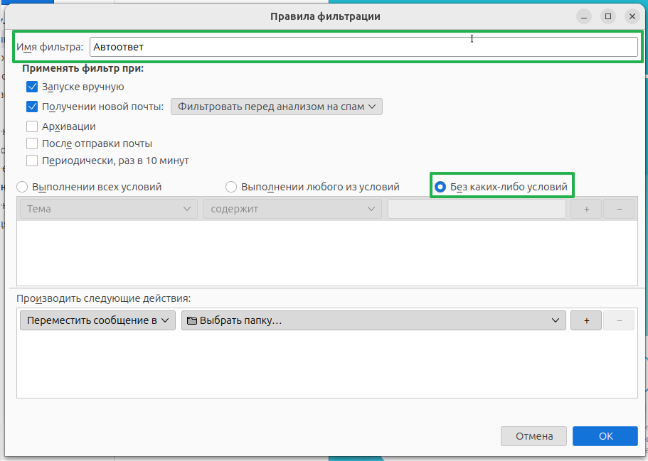 5. Дайте название вашему фильтру и выберите условия для запуска автоответа, или выберите пункт Без каких-либо условий: