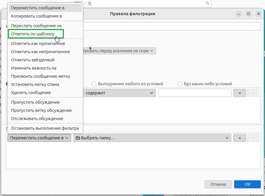 6. В поле Производить следующие действия в стандартном действии выберите Ответить по шаблону: