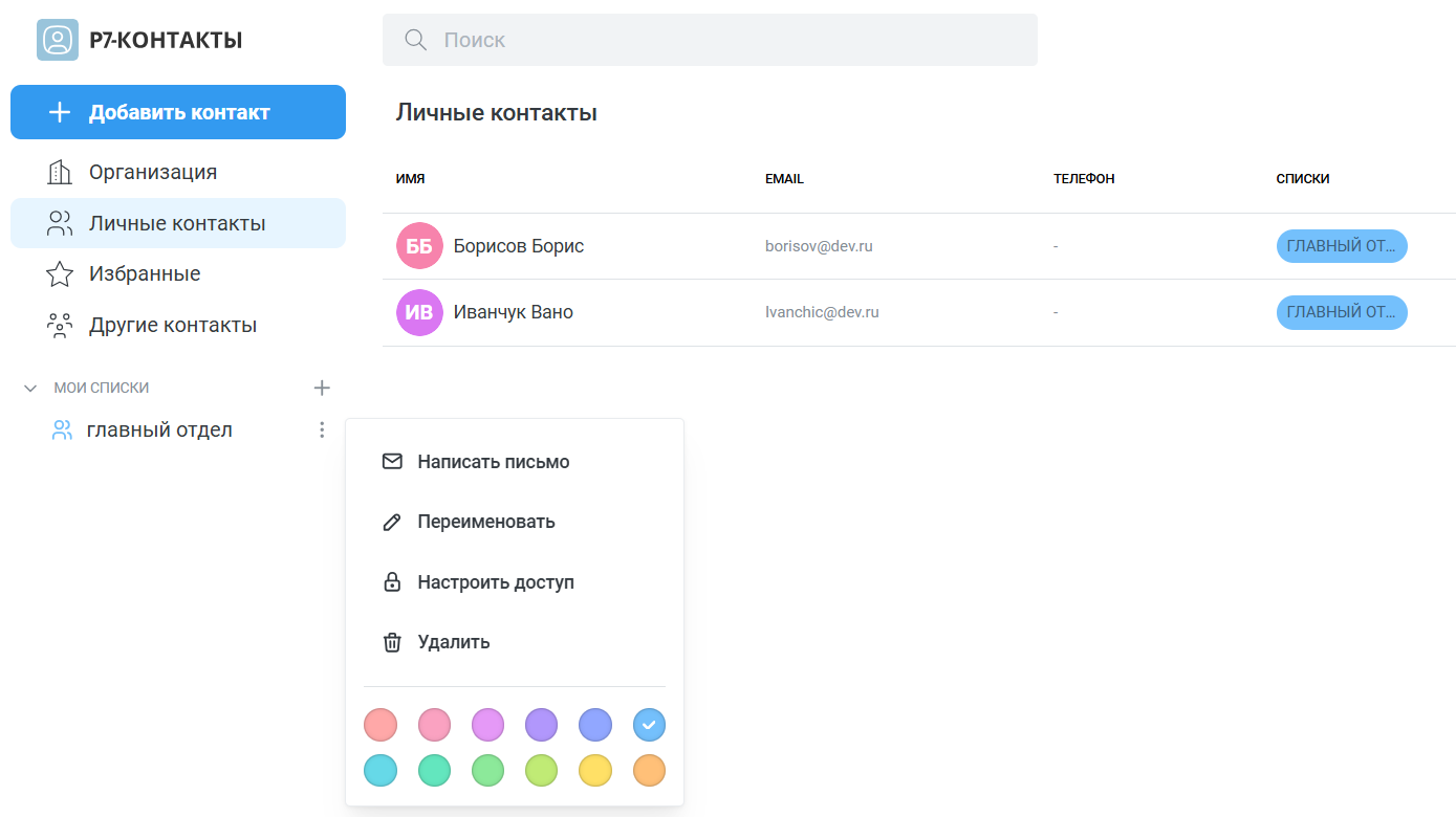 В модуле Контакты в разделе Мои списки вы можете предоставить доступ к своим адресным спискам другим пользователям.