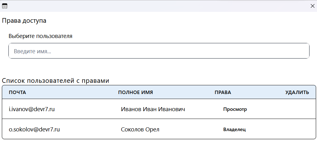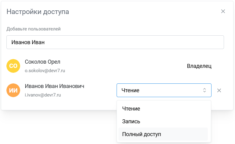 Также через поисковую строку можно найти и добавить пользователя, затем можно задать ему необходимый доступ. По умолчанию устанавливается — “Просмотр”. Для удаления прав используйте кнопку корзина.