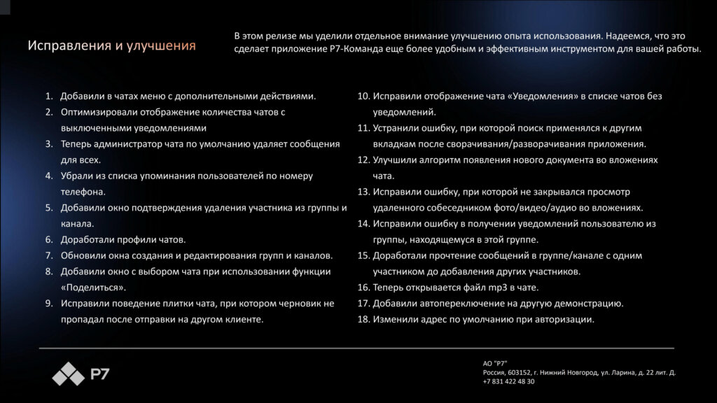Информация о новых функциях, улучшениях и исправлениях в обновлении продукта