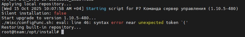 Ошибка syntax error near unexpected token указывает на то, что один из скриптов обновления (configFunc.sh) не может корректно обработать данные из-за наличия в них неожиданного символа.